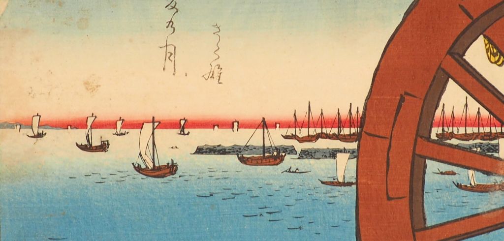 HIROSHIGE (1797-1858) Estampes oban tate-e de la série des « Cent vues célèbres de Edo », Meisho Edo Hyakkei. Editeur : Uoya Eikichi, vers 1856-1858 Ushimachi dans le district de Takanawa (Salissures, marges légèrement rognées, angles inférieurs fragilisés, petit accident à une bordure)