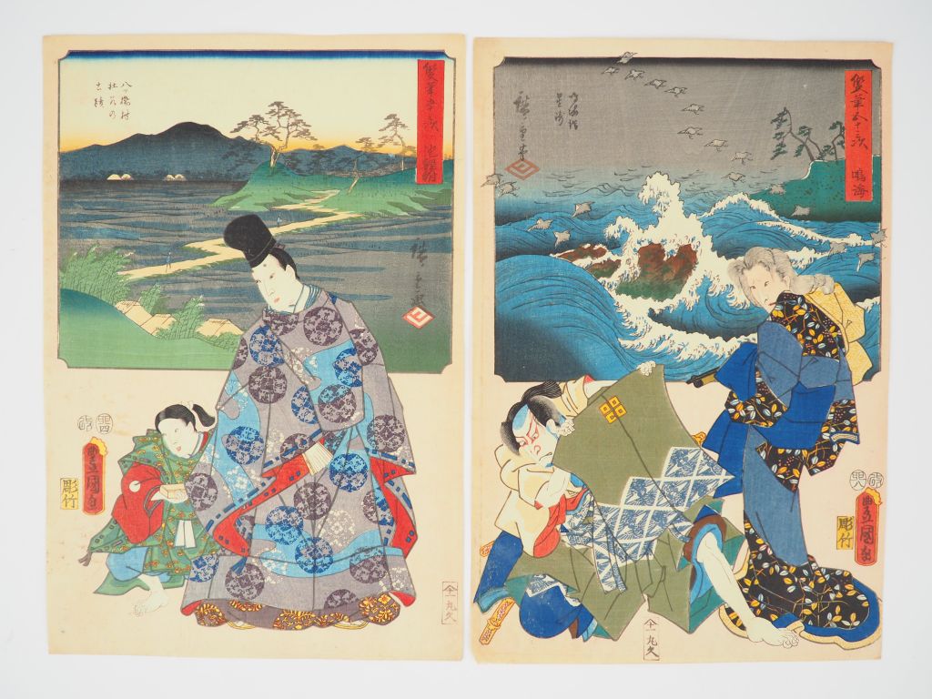 HIROSHIGE (1797-1858) et TOYOKUNI III (1786-1865) Cinq estampes de la série des « Cinquante-trois stations du Tokaidô » dit « Tokaidô à deux pinceaux », Sôhitsu Gojûsan tsugi. Editeur : Maruya Kyūshirō, vers 1854-1855. Comprenant : - Maisaka , Vue de la mer à Imagiri , musicienne aveugle - Arai , Vue du lac et de la zone de Horie35. Yoshida , Le grand pont sur la rivière Toyokawa , acteur Arashi Rikan III et Ichikwa Dan Jûrô VIII - Chirû , Site historique à Yatsuhashi , Narihira - Narumi , L’anse Narumi et Hoshizaki , les acteurs Morita Kan’ya XII dans le rôle Narumi et Ishikawa Kodanji IV dans le rôle de Tan’emon - Yoshida, le pont sur la rivière Toyokawa, avec les acteurs Arashi Rikan III (?) et Ichikawa Danjūrō VIII (Quelques salissures et une – Maisaka - légèrement accidentée)