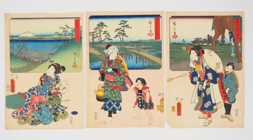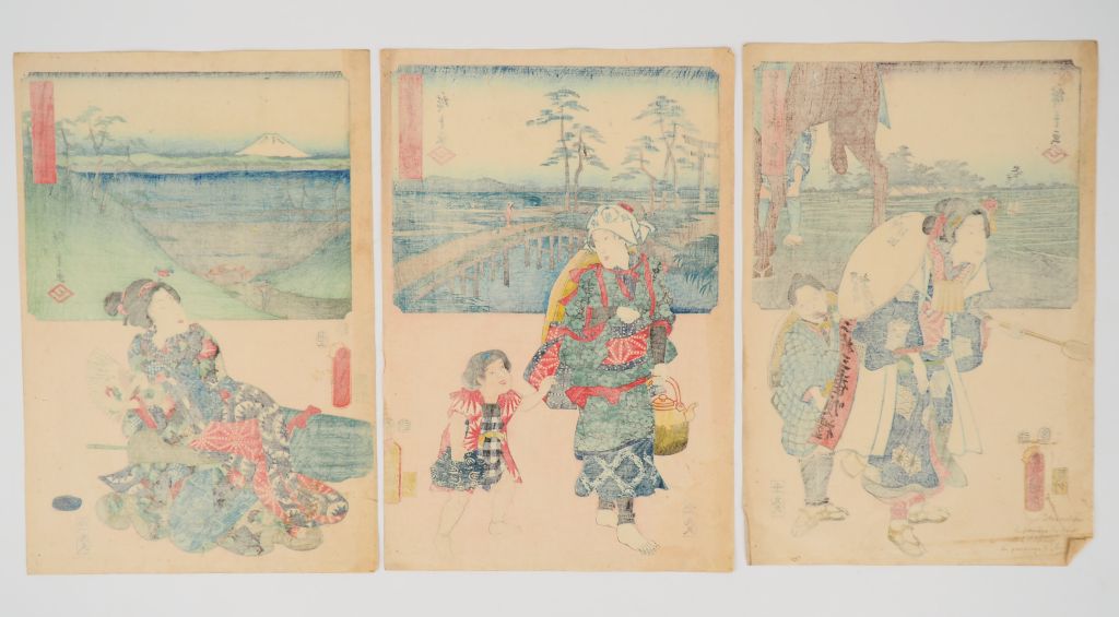 HIROSHIGE (1797-1858) et TOYOKUNI III (1786-1865) Cinq estampes de la série des « Cinquante-trois stations du Tokaidô » dit « Tokaidô à deux pinceaux », Sôhitsu Gojûsan tsugi. Editeur : Maruya Kyūshirō, vers 1854-1855. Comprenant : - Fuji eda , La rivière Seto à gué, chaise à porteur - Shimada , Voyageuse à la rivière Ôi - Kanaya , Vue panoramique de la rivière Ôi et du mont Fuji , l’acteur Bandô shûka Ier dans le rôle du musicien aveugle Asago - Kakegawa , Une jeune fille de la campagne (inakamusume) - Fukuroi , Une femme pèlerin (Une doublée, certains angles inférieurs fragilisés, petites salissures et pliure centrale à l’une)