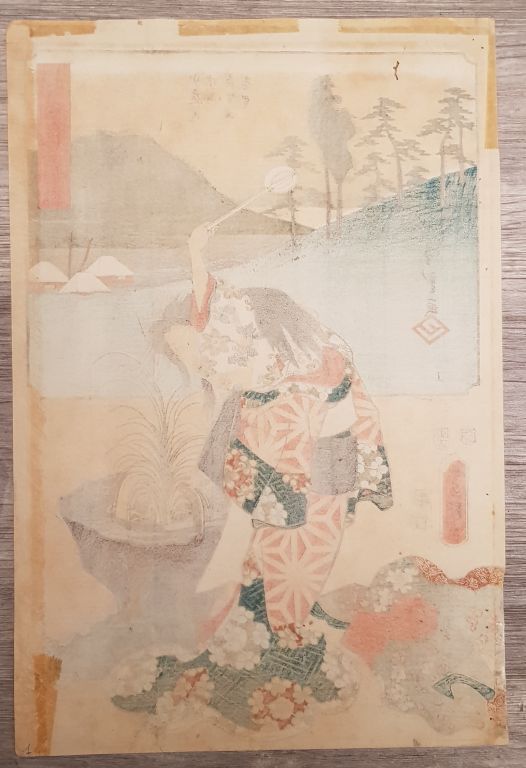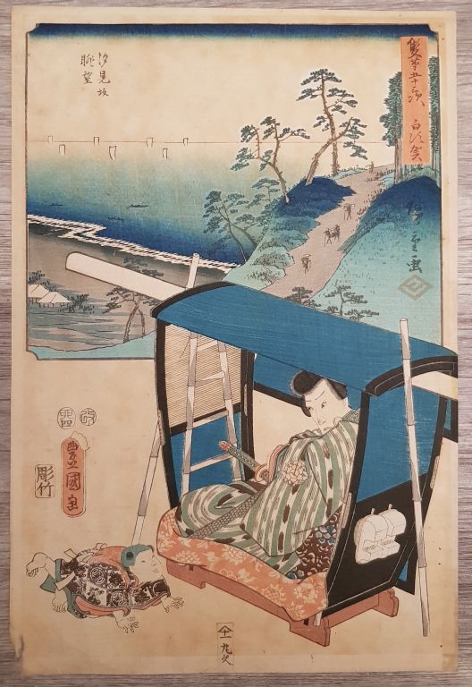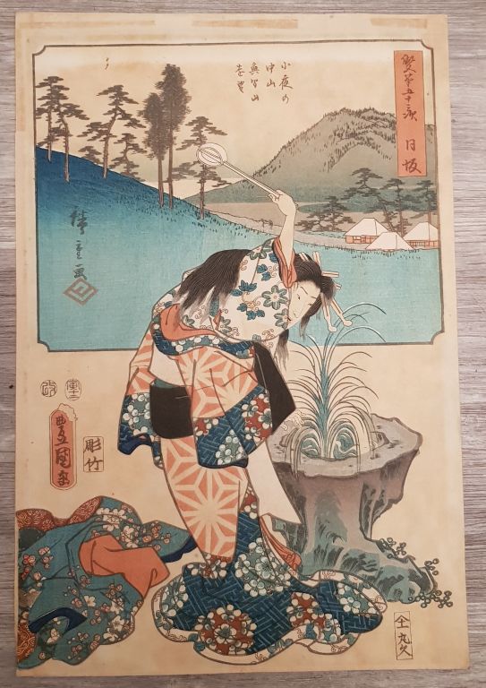 HIROSHIGE (1797-1858) et TOYOKUNI III (1786-1865) Trois estampes de la série des « Cinquante-trois stations du Tokaidô » dit « Tokaidô à deux pinceaux », Sôhitsu Gojûsan tsugi. Editeur : Maruya Kyūshirō, vers 1854-1855. Comprenant : - Nissaka, Sayo no Nakayama et une vue du Mont Muken - Shirasuka, vue panoramique de Shiomizake , l’acteur Ichikawa Danjūrō VIII dans le rôle de Jiraiya - Fujikawa, voyageuses (Jaunies, salissures, deux angles inférieurs gauches légèrement abimés)