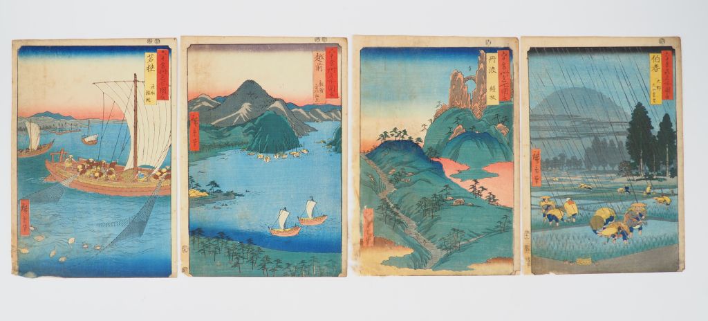 HIROSHIGE (1797-1858) Huit estampes oban tate-e de la série des « Vues de lieux célèbres dans les soixante et quelques provinces », Rokujiû yoshû meisho zue Editeur : Koshihei (Koshimuraya heisuke) Comprenant : - Wakasa gyosen kareiami , Bâteau de pêche au filet dans la province de Wakasa - Echizen tsuruga kebi no matsubara , La forêt de pin de Kebi à Tsuruga, province d’Echizen - Tamba kagamizaka , La colline miroir, province de Tamba - Hoki Ôno ôyama enbo , Vue lointaine du mont Oyama près de Ono, province de Hoki - Iwami takatsuyama shiohama , La plage des salines près du mont Takatsu, province d’Iwami - Harima maiko no hama , La plage de Maiko, province de Harima - Suô Iwakuni kintaibashi , Le pont de Brocart à Iwakuni, province Suô - Awa Naruto Fûha , Mer forte à Naruto, province de Awa (La plupart des marges inférieures coupées, certaines autres légèrement rognées, angles inférieures gauches fragilisés, salissures, deux doublées)