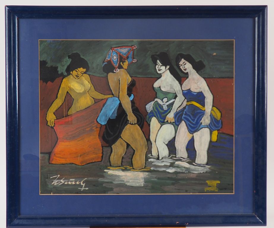HOANG SUNG "Jeunes femmes au bain" Encre et couleurs sur papier. Signée. Indochine Xxème siècle. 52 x 64 cm