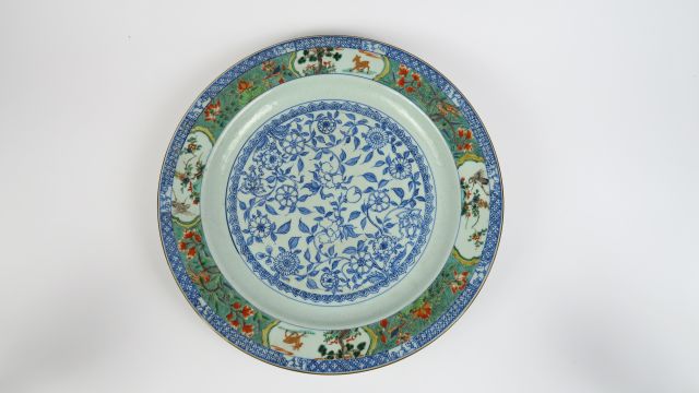 Important plat rond en porcelaine blanc et bleu et peint d'émaux de la famille verte, absence de marque. Compagnie des Indes, XVIII ème siècle. Diam. 39 cm