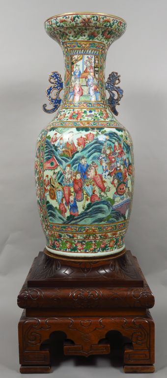 Important vase de palais en porcelaine et émaux de la famille rose, à décor de cérémonie taoiste en médaillon, de l'arrivée d'un mandarin et de sa suite, et d'oiseaux, fleurs et papillons. Deux dragons stylisées ornent la base du col. Chine, vers 1880. H. 85,5 cm (accidents)