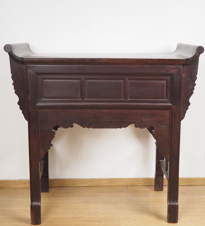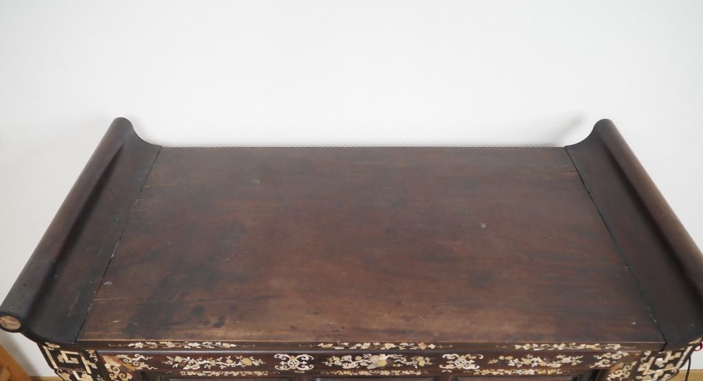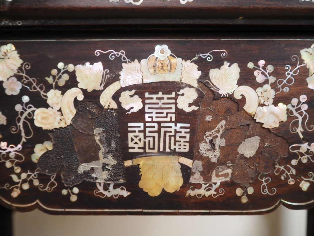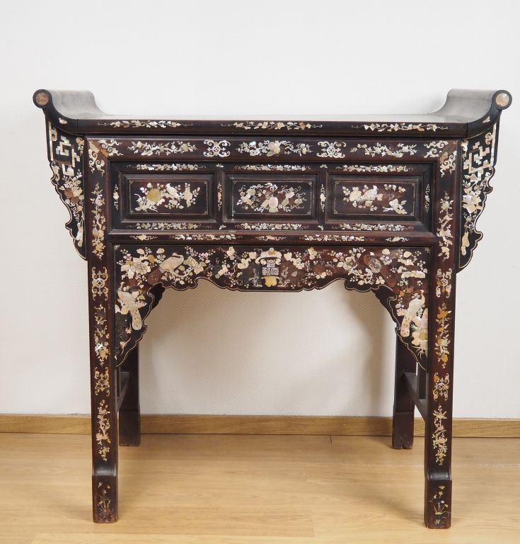 Importante console reposant sur 4 pieds en bois de palissandre "dalbergia cochinchinensis" à décor finement décoré en marqueterie de nacre de faisans évoluant parmi des branchages fleuris, objets mobiliers, compositions florales et de motifs auspicieux. Les extrémités du plateau à enroulement. Indochine XIXème dynastie des Nguyen. Dim. 107 x 110 x 57 cm. (accidents, manques, sauts de nacre)