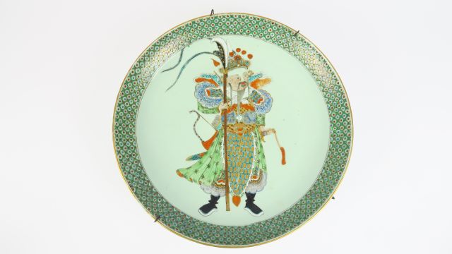 Importante coupe en porcelaine et émaux famille rose, représentant un Guandi en armure tenant une allebarde, la bordure ornée de mille fleurs stylisées. Chine, période Guanxu, vers 1880.