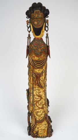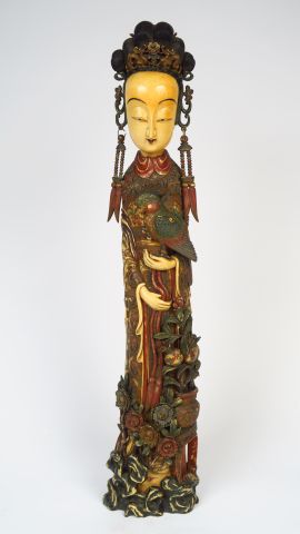 Importante sculpture en ivoire polychrome, représentant une jeune femme debout tenant un cacatoes dans ses mains, une composition florale à ses pieds, portant un diadème orné de deux dragons. Japon, vers 1920-1930. H. 92.5 cm Poids. 12.5 kg Vente aux enchères conforme aux dernières instructions (17/11/2017) du Ministère transmises par le Conseil des Ventes.