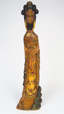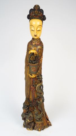 Importante sculpture en ivoire polychrome, représentant une jeune femme au dragon, tenant un panier fleuri, un brûle-parfum à ses pieds, sa coiffe ornée de deux phénix. Japon, vers 1920-1930. H. 93 cm Poids. 16.6 kg Vente aux enchères conforme aux dernières instructions (17/11/2017) du Ministère transmises par le Conseil des Ventes.