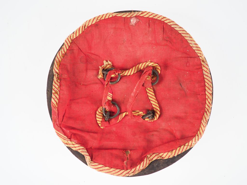 Inde, fin XIXe siècle, Petite rondache indienne en acier bronzé à quatre brossettes appliquées, ceinturée d'une frise crénelée sur le pourtour et tapissée d'arabesques végétales dorées et argentées. Le revers, doublé de tissu rouge à quatre anneaux en suspente.