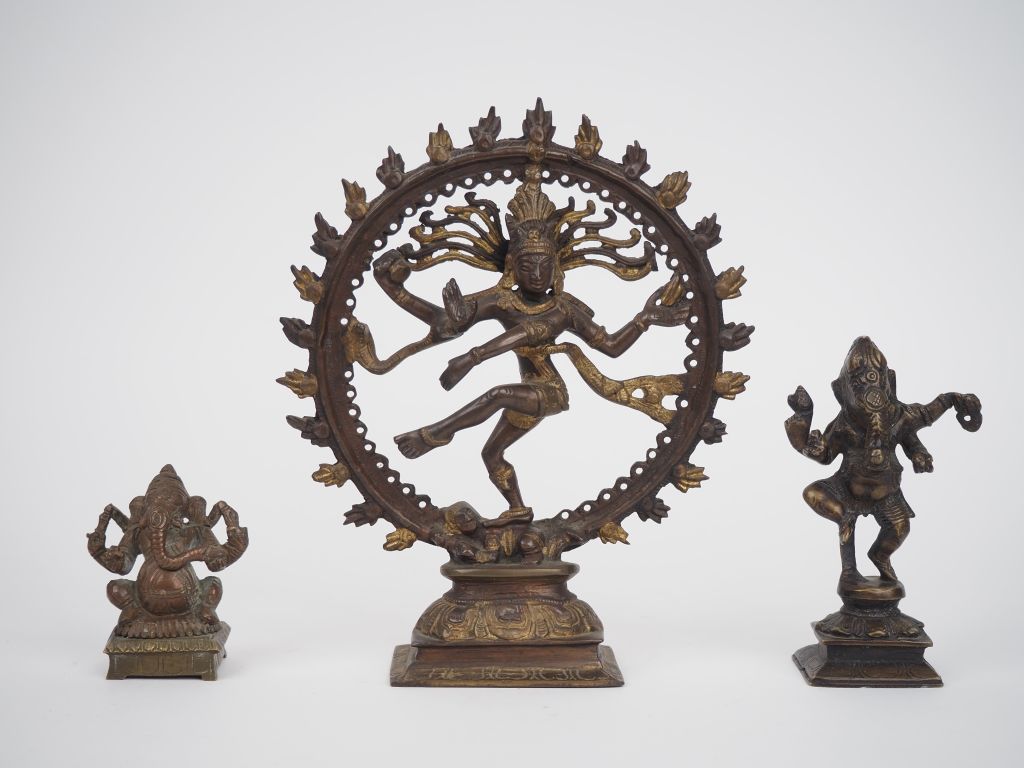 Inde XXe siècle, Trois statuettes en bronze, dont deux représentations de la divinité Ganesh, Shiva nataraja dansant dans une mandorle enflammée piétinant le démon Apasmara. H. 10 cm H. 14 cm et 17 cm