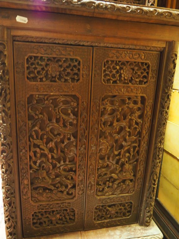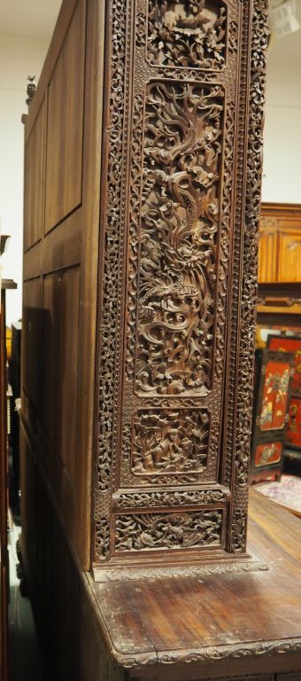 Indochine, dynastie des Nguyen vers 1880, Important meuble deux-corps en bois finement sculpté et ajouré de fleurs et rinceaux feuillagés, pagodons…reposant sur quatre pieds zoomorphes. Dim. 305 x 206 x 57 cm