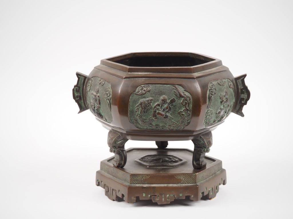 Indochine, fin XIXe siècle, Brûle parfum tripode couvert, de forme hexagonale, en bronze à décor en médaillon de scène scènes légendaires, reposant sur un socle à décor en léger relief d’un phénix lové. Dim. 20 x 25 x 20 cm