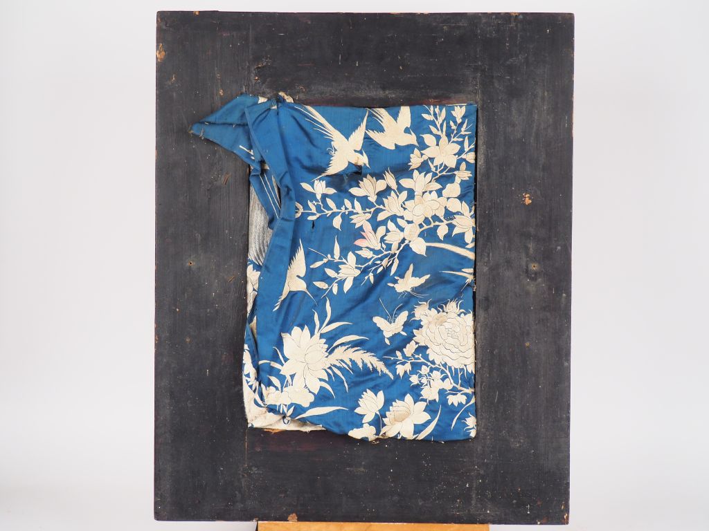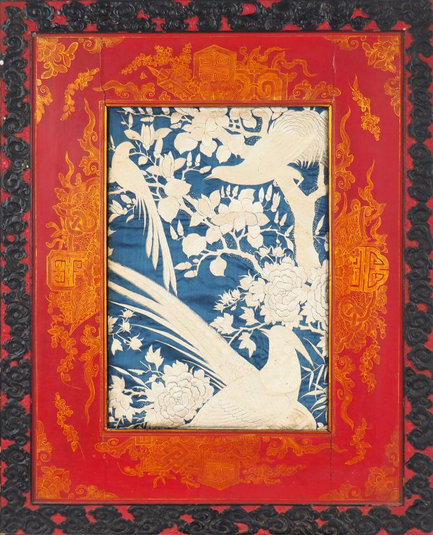 Indochine, vers 1900 Broderie sur soie bleu à décor beige crème de trois faisans perchés sur des branches de pivoines en fleurs. Encadrement en laque rouge et rehauts d’or. Dim. 71 x 58 cm (déchirures, taches, fente sur le cadre en bois)