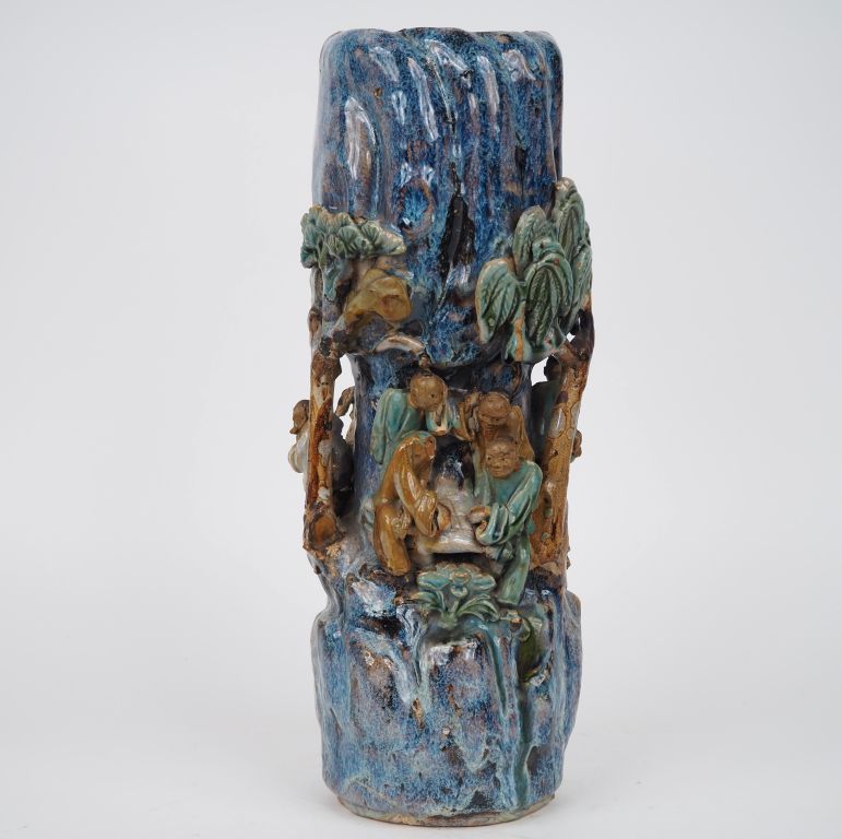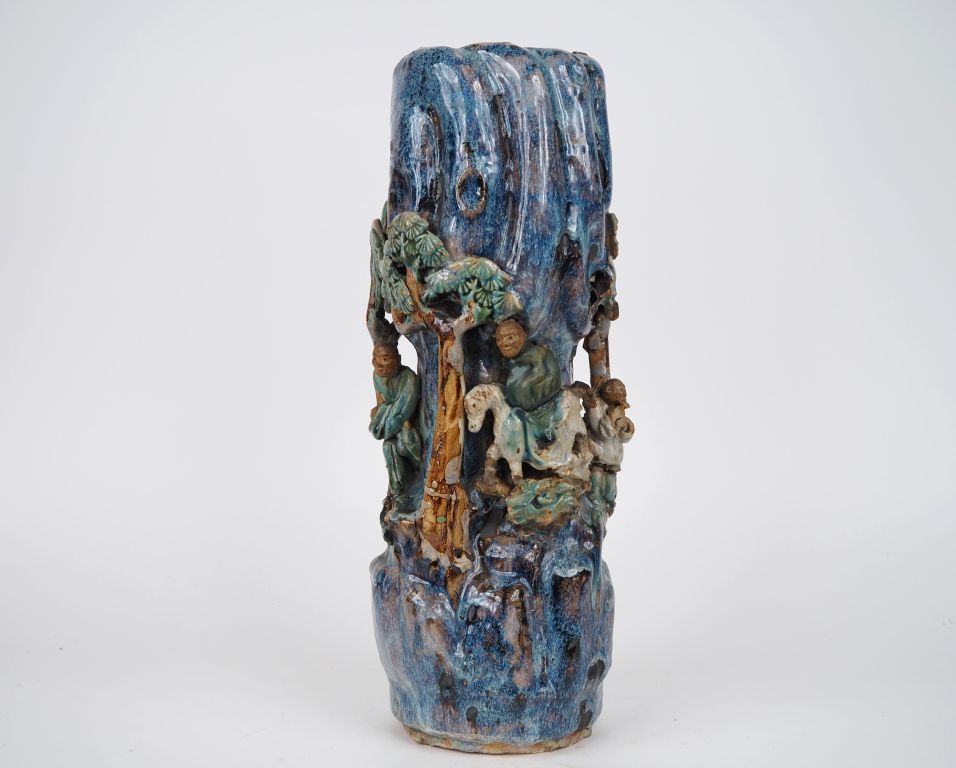 Indochine, vers 1900, Vase en céramique émaillée vert, brun et bleu, à décor de personnages sous des pins de longévité. Manques têtes H. 46 cm