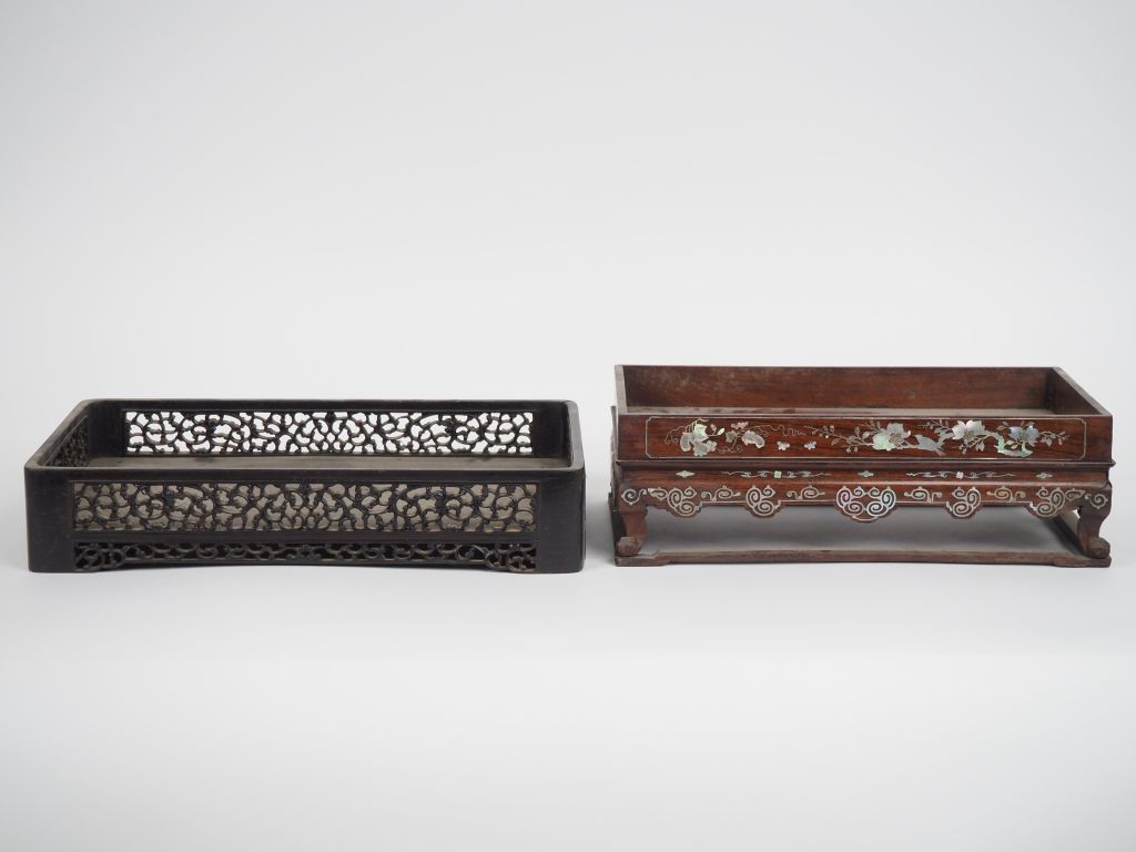 Indochine, vers 1920, Deux plateaux en bois de palissandre"dalbergia cochinchinensis" l'un à décor ajouré d'entrelacs de chilong parmi des feuillages, l'autre orné en marqueterie de nacre d'oiseaux, fleurs, pampres de vignes et ruyi. Dim. 33,5 x 22 , Dim. 9 x 29 x 17 cm
