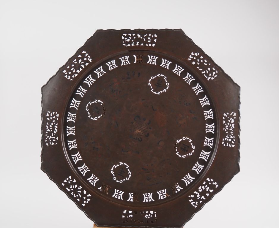 Indochine, vers 1920, Important plateau octogonale en cuivre, à décor niellé et ajouré, de symboles shou, calligraphies et motifs stylisés. Diam. 70 cm