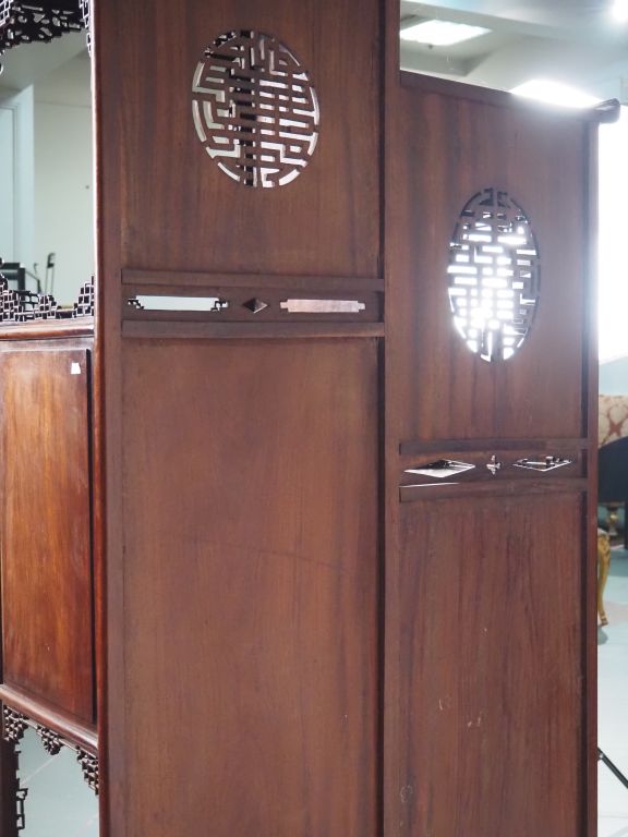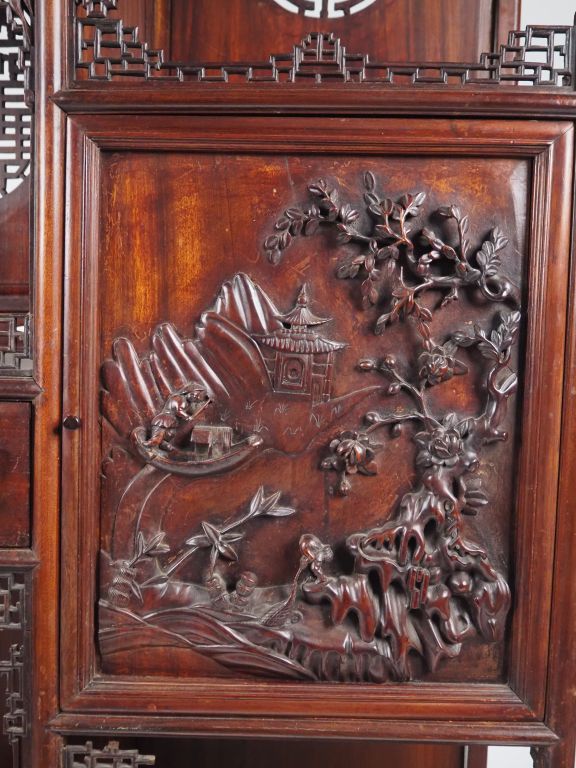 Indochine, vers 1920 Meuble à étagères à pieds galbés, ouvrant à une porte en bois naturel, à décor en demi-relief d’un homme sur une embarcation face à un pavillon dominant un fleuve, compositions florales, calligraphies stylisées et grecques complétant l’ornementation. (accidents, manques)