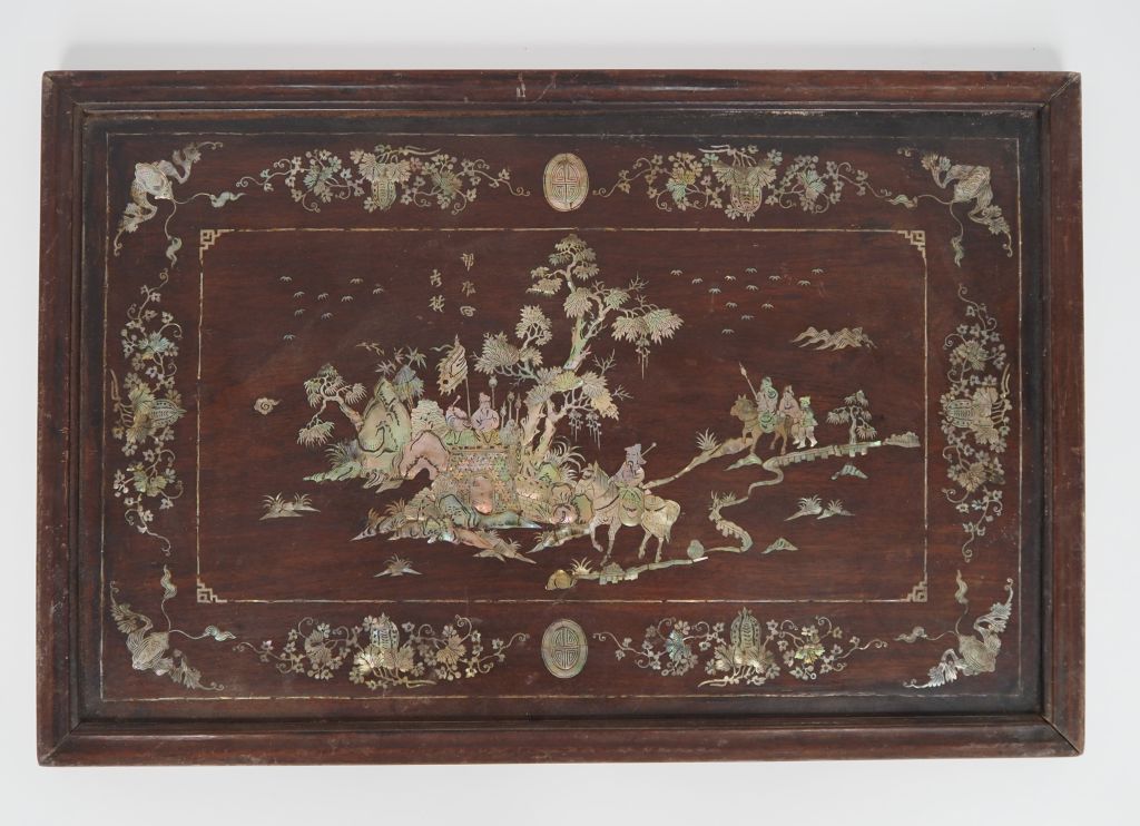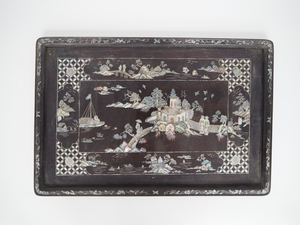 Indochine, vers 1920, travail de Nam Dinh Deux grands plateaux, de forme rectangualire en bois de palissandre "dalbergia cochinchinensis" à décor en marqueterie de nacre d'une cité fortifiée sur une île et cavaliers parcourant un sentier. Petits manques. Dim. 40 x 60 cm