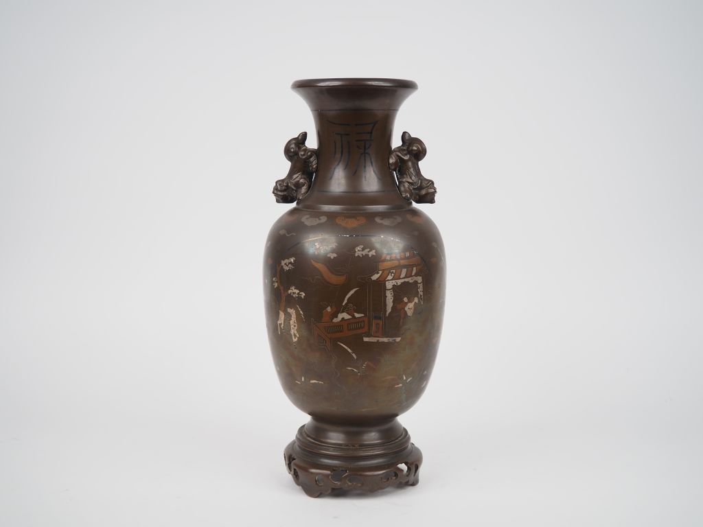 Indochine vers 1920. Vase balustre en bronze à décor niellé d'argent de personnages dans des pavillons. La base du col ornée d'une frise de têtes de Ruyi. Portour du col à motifs calligraphiés "bonheur" et "richesse". Les anses en forme de lions boudhiques. H. 35.5 cm.