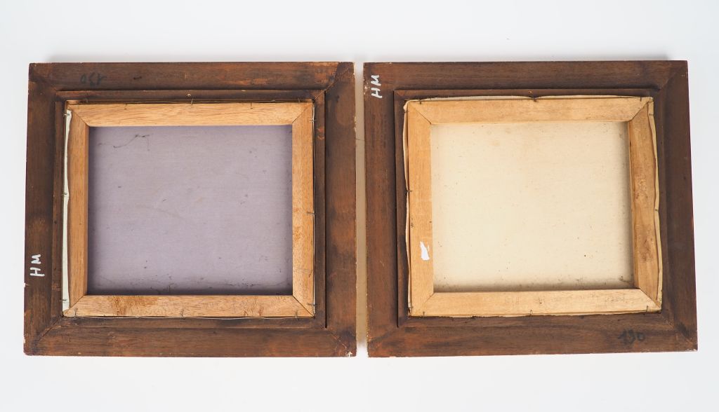 Indochine, vers 1930, Deux huiles sur toile représentant une scène de village et une scène de récolte dans les champs. Dim.30 x 35 cm