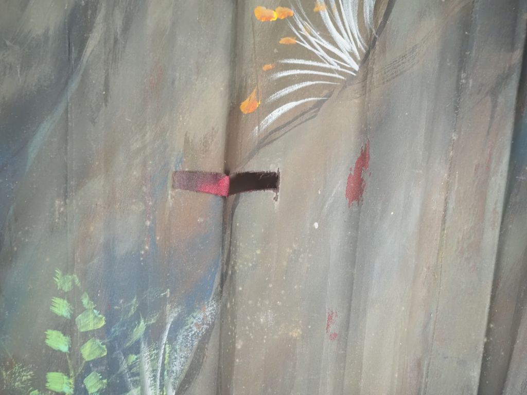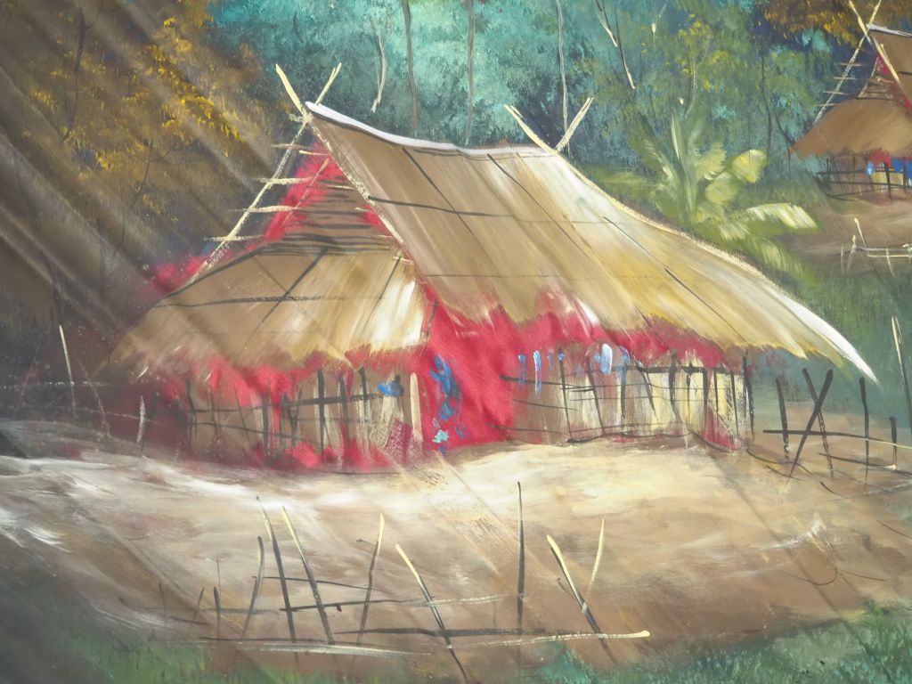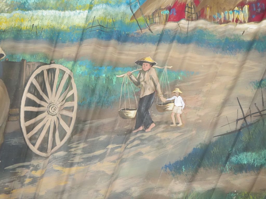 Indochine, vers 1930, Gouache sur éventail à décor polychrome de paysans avec charrue et bœufs Dim. 202 x 340 cm