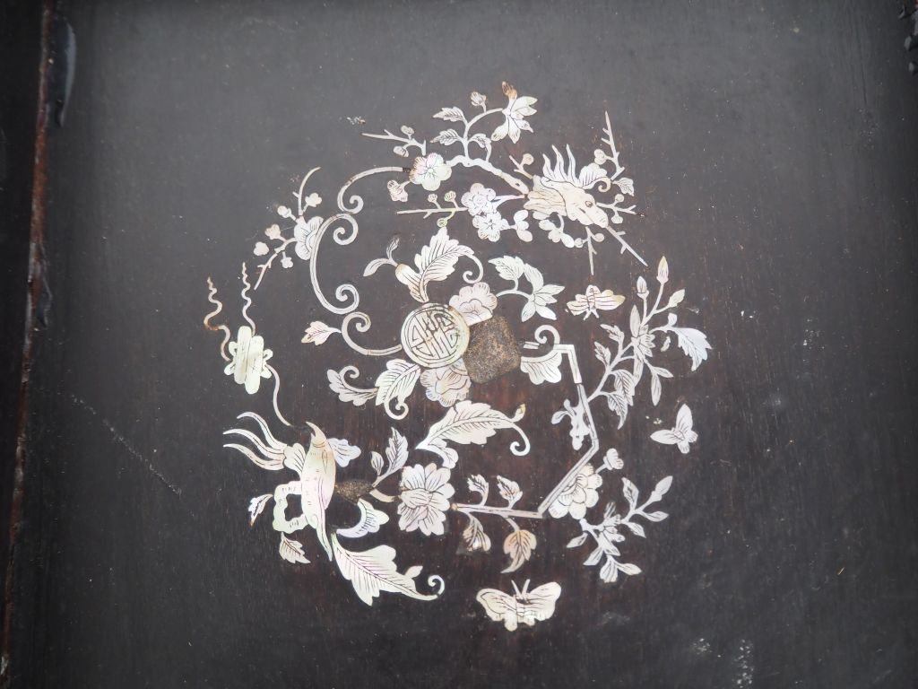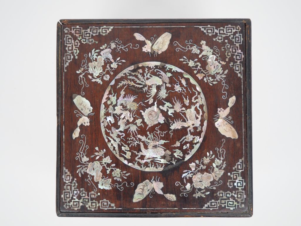 Indochine vers1920, Coffret couvert en bois de palissandre "dalbergia cochinchinensis" à décor en marqueterie de nacre de dragon, phénix, papillons et fleurs collé sur son piétement. Accidents et manques, restauration. Dim. 17 x 25 x 25 cm