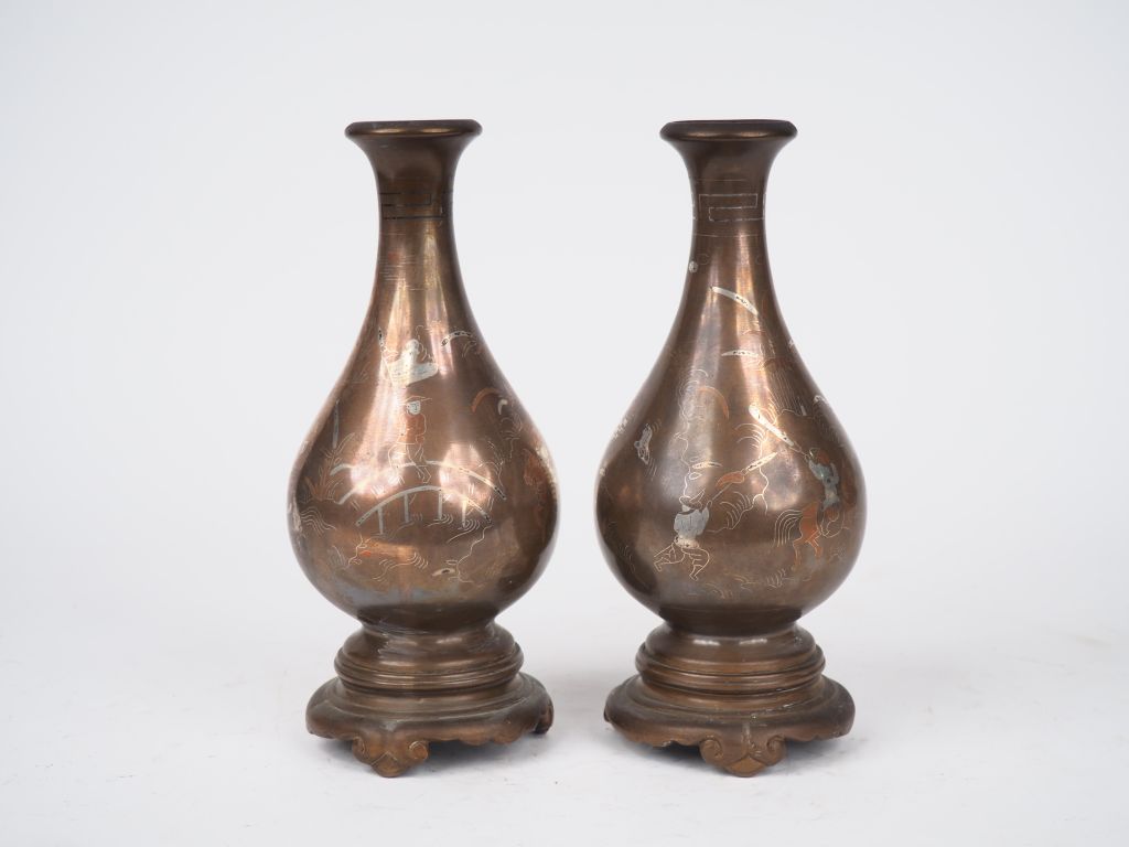Indochine, XIXe siècle, Paire de vases balustres en bronze à patine claire, à décor niellé d'argent de personnages. H. 24 cm