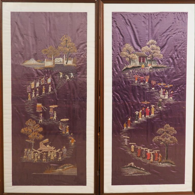 Indochine, XXe siècle, Deux tentures formant pendant en soie et lin brodé à décor d’une procession. Dim. à vue. 127 x 55 cm
