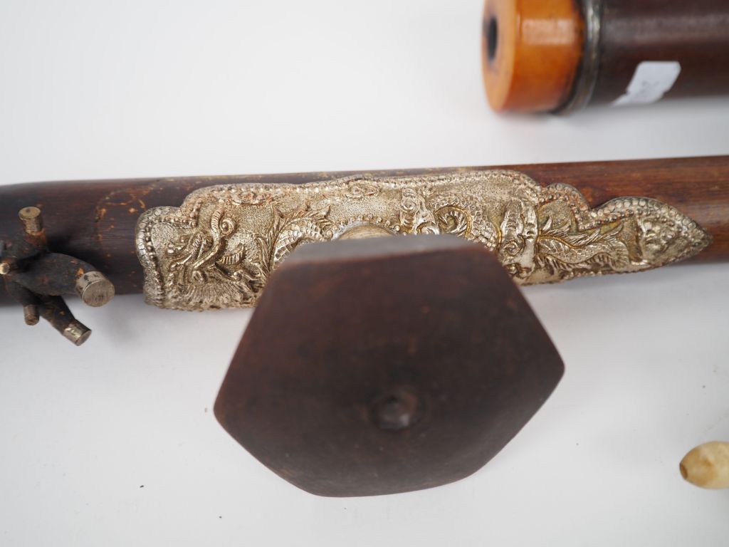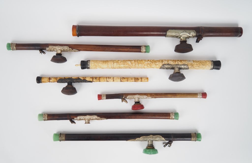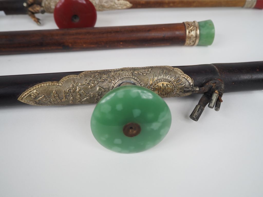 Indochine, XXe siècle, Lot comprenant cinq pipes à opium en bambou, les extrêmités à l'imitation de la jadéite et pierres dures, On y joint deux pipes en os. L. 42 cm L. 62 cm