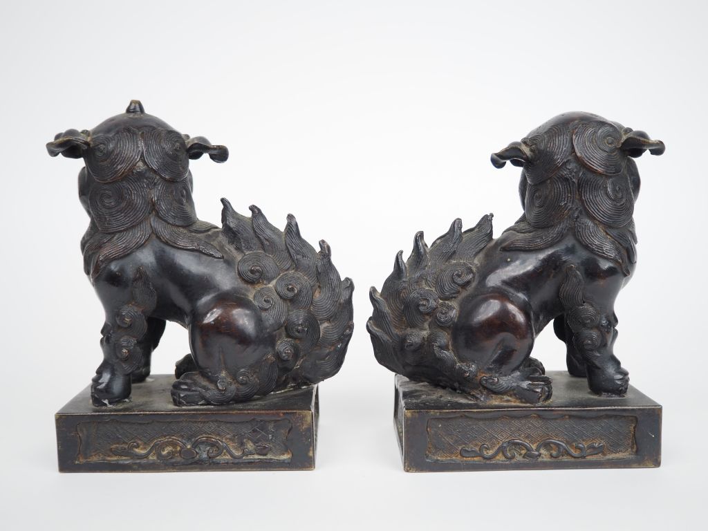 Indochine XXe siècle, Paire de lions bouddhiques en bronze reposant assis sur des terrasses, la tête légèrement tournée. H. 18 cm et 17 cm L. 14 cm