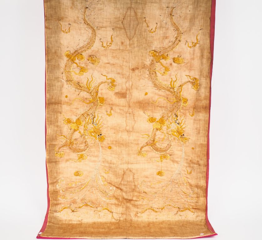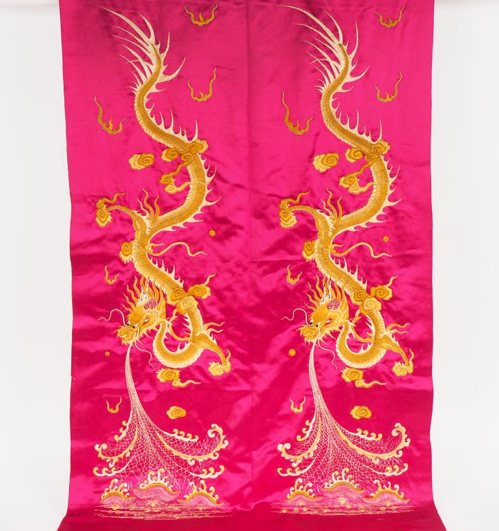 Indochine XXe siècle Panneau en soie et lin à décor de deux dragons reposant sur un fond fushia. H. 133 x 70 cm