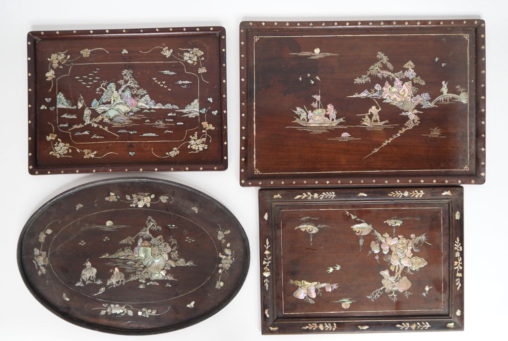 Indochine XXe siècle, Quatre plateaux, dont trois de forme rectangulaire, et un de forme ovale en bois de palissandre "dalbergia cochinchinensis" à décor de scènes de paysages lacustres animés de personnages. Petits manques et gerces Dim. 29 x 41 Dim. 29 x 40 dim.33 x 49 cm L. 47 cm