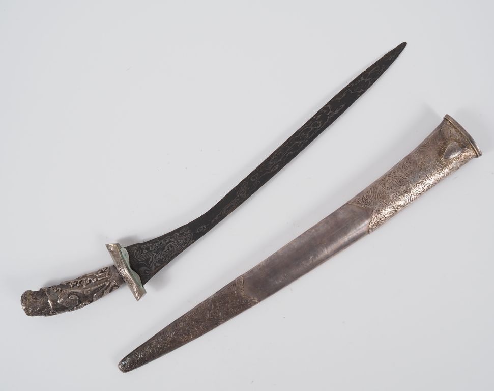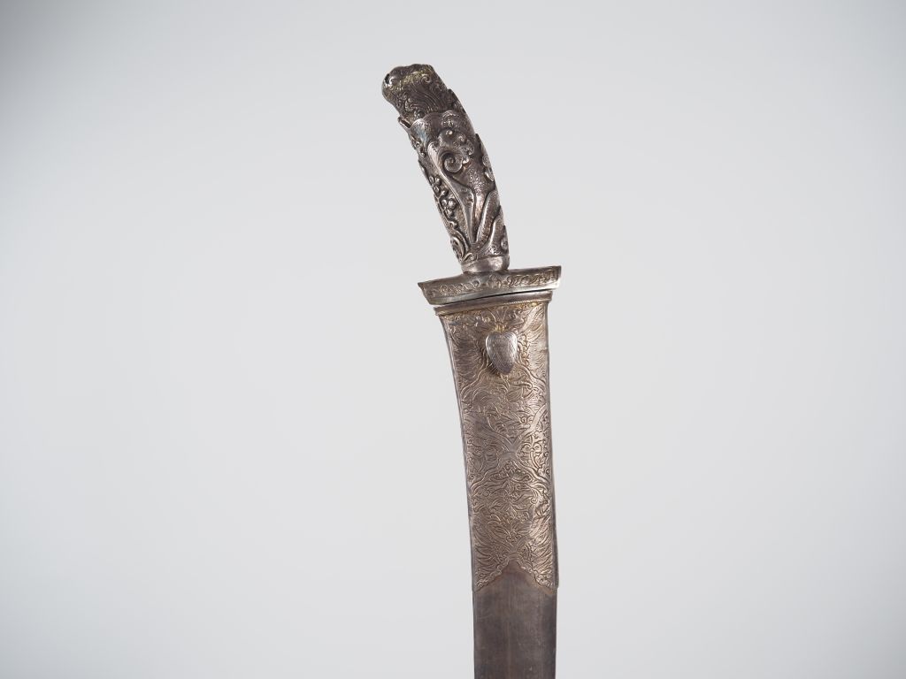 Indonésie, XIXe Poignard, avec poignée et fourreau en argent à motifs stylisés. Lame droite avec légère ondulation en acier avec motifs « pamor ». L. 46 cm