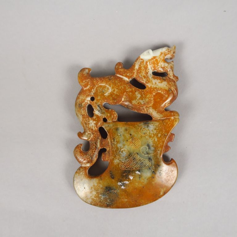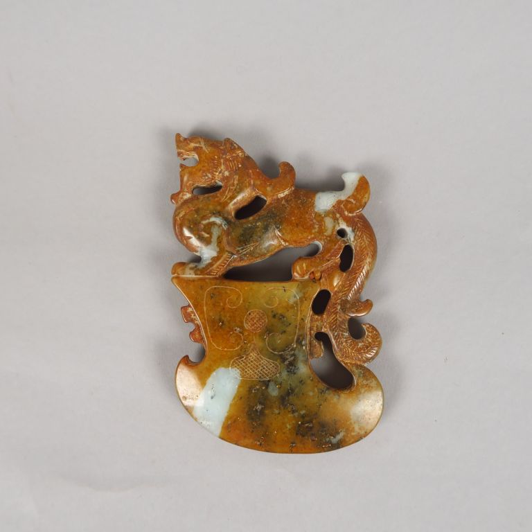Jade archaïsant représentant une hache cérémoniale surmontée d'un dragon. Chine, fin du Xxème siècle. H. 11 cm