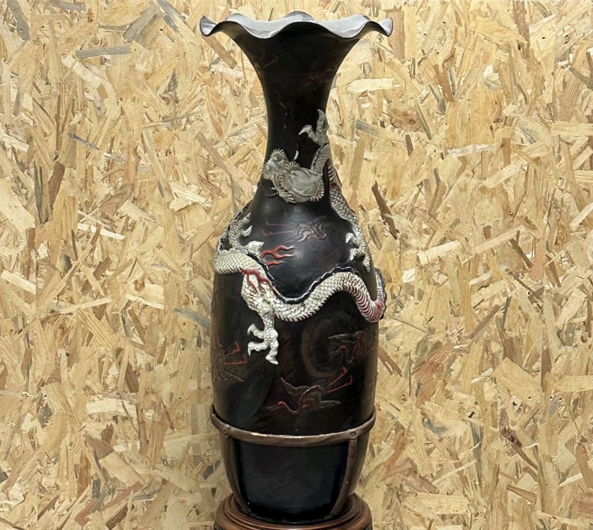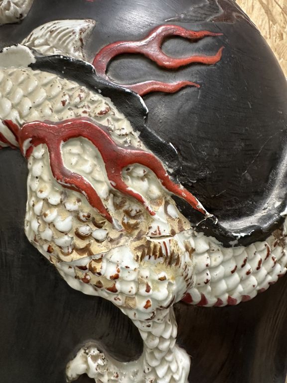 Japon, Arita vers 1900, Important vase balustre à col pavillonné en corolle, en porcelaine laquée, à décor en léger relief d’un dragon en porcelaine émaillée blanche et grues en laque rouge et or en vol. Accidents. H. 112 cm