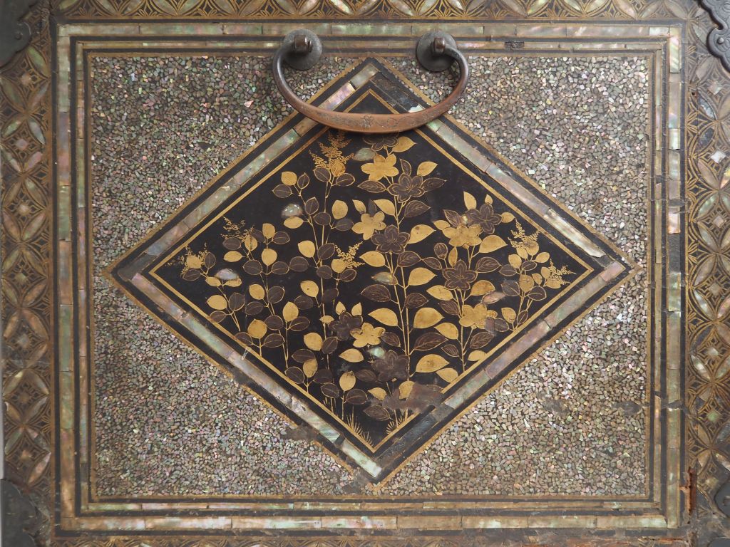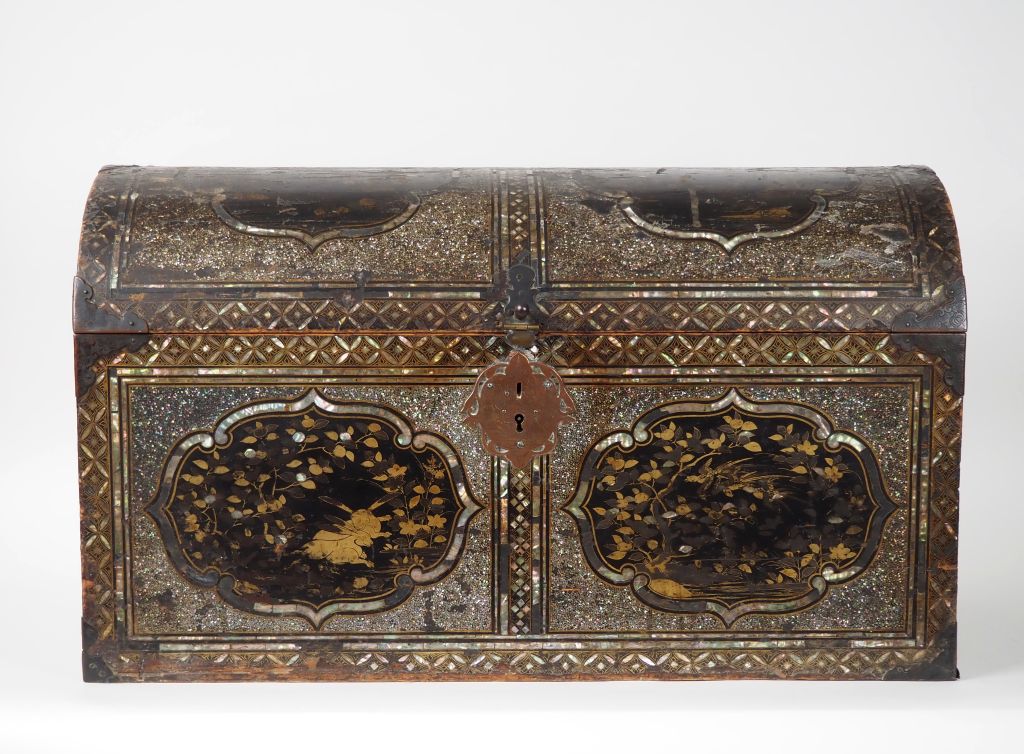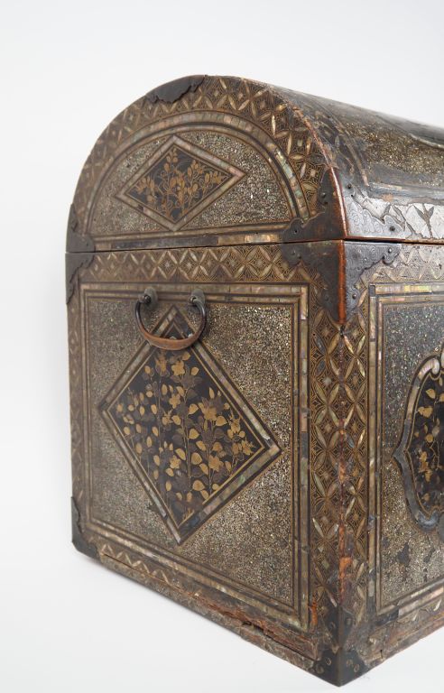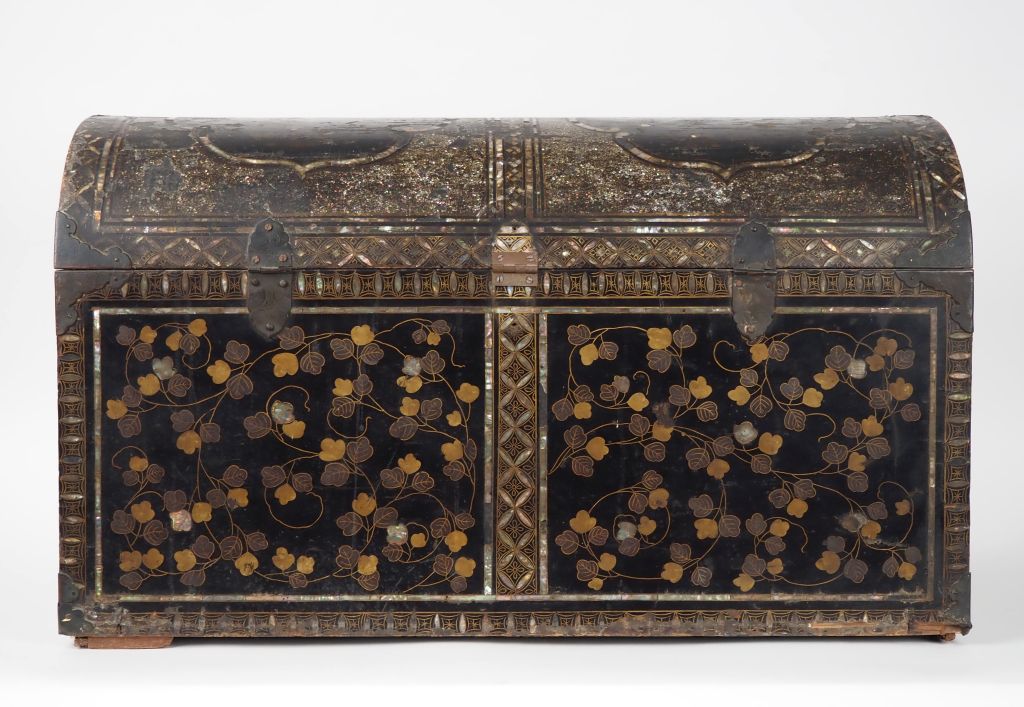 Japon, début de la période Edo, XVIe siècle, Important coffret de voyage, à couvercle bombé dit "Namban" en bois laqué noir à décor de fleurs et feuillages à l'or, dans des médaillons floriformes et en losanges, sur fond ao gai et incrustation de nacre. L’intérieur en laque noire à décor à l’or de tressages et feuillages. Le pourtour orné de frise de motifs géométriques. Les poignées en cuivre. Usures et petits manques. Dim. 47,5 x 82 x 39 cm