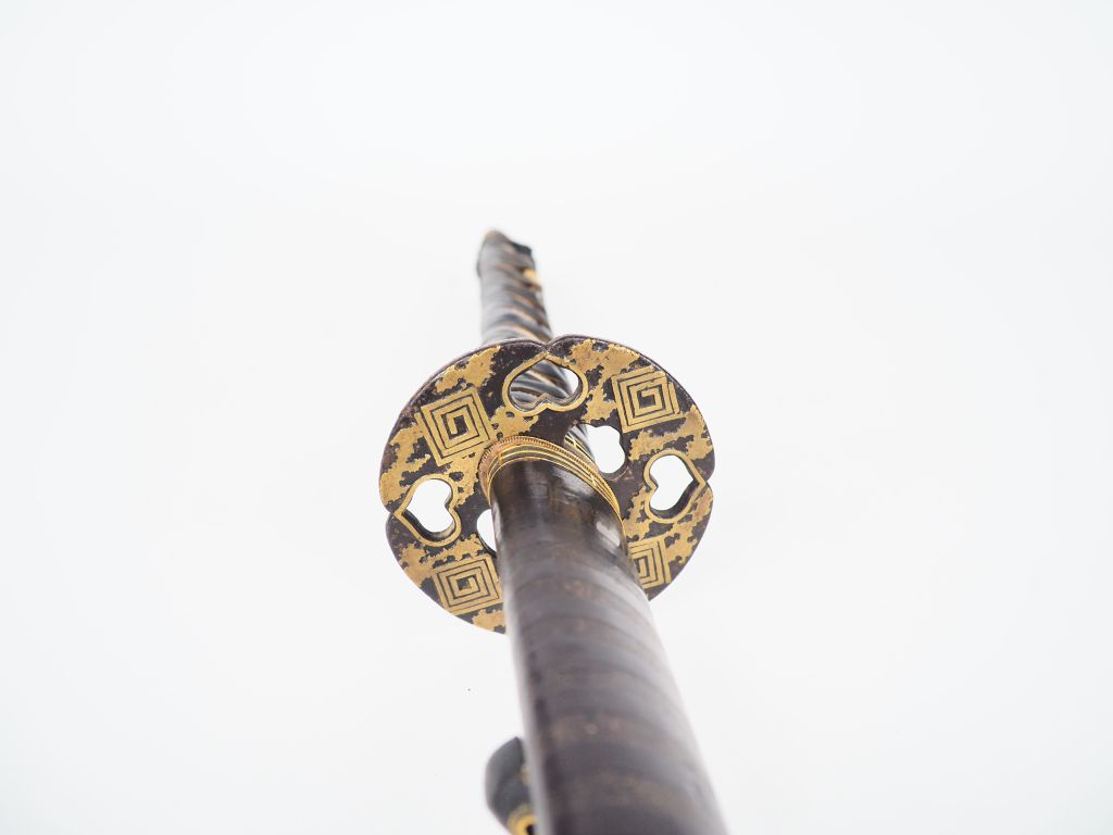 Japon, école de Bizen, période Muromachi, XVe siècle (pour la lame) KATANA à lame à shinogi-zukuri, gunome hamon peu lisible, nakago à deux mekugi-ana, signé Morimitsu , koshirae de type handachi, avec fourreau laqué noir à décor alternant anneaux mats et anneaux en nashiji, les éléments de style shakudo et rehauts dorés, les menuki figurant lance et bâton de commandement, la tsuba mokko-gata en fer, ajourée de feuilles d’aoi et incrustée de motifs géométriques et stylisés en sentoku. (Lame graissée, salissures, pointe du kissaki légèrement ébréchée) L. 70,5 cm