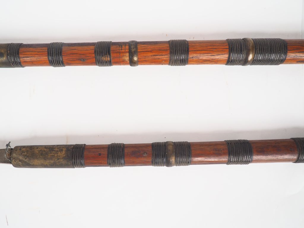 Japon, période Edo, Deux lances de type suyari à rainure centrale Hi soulignée en rouge , avec long manche rehaussé de bague en métal fourreaux laqués noir. (Non démontées, manques)