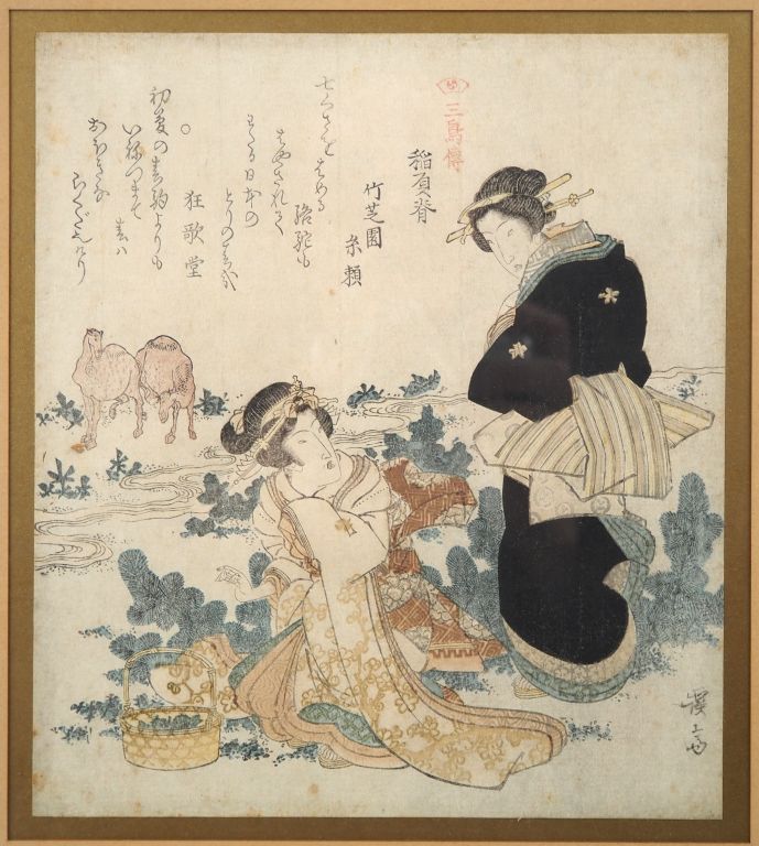 Japon, période Meiji (1868-1912) Surimono par Keisai Eisen (1790-1848) « Inabise » de la série Sanchoden « Histoire de trois oiseaux » Insolée. Dim. 20 x 18 cm