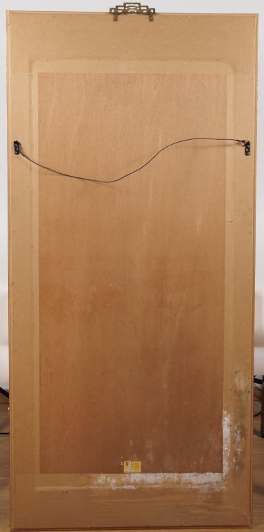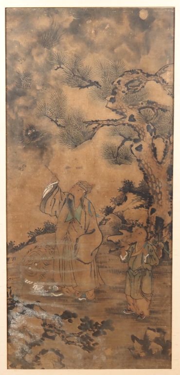 Japon, période Meiji Peinture à l’encre et couleurs sur papier, représentant un lettré accompagné de son disciple traçant un dragon à travers les nuages à l’aide de son pinceau, la scène se déroulant sous un pin de longévité. Dim. 127 x 59,5 cm