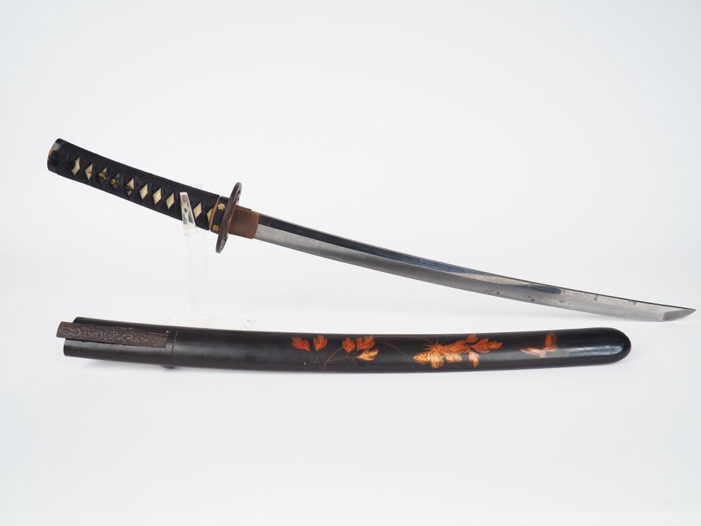 Japon, période Muromachi, XVe-XVIe siècle WAKIZASHI à lame à shinogi-zukuri, gunome hamon régulier, nakago suriage, à trois mekugi-ana, non signé , kashirae avec fourreau laqué noir orné de pivoines en laque brun-rouge et or, sukashi tsuba en fer figurant une gerbe, fuchi en shakudo, kashira simple, deux menuki à motifs floraux , kogai et kogatana à décor repoussé de dragons. (Salissures, kizu , kogai et kogatana oxydés) L. 46,5 cm