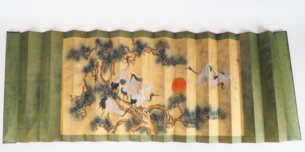 Japon, période Taisho (1912-1926) Makemono en éventail représentant des grues au coucher du soleil. Dim. 142 x 45 cm