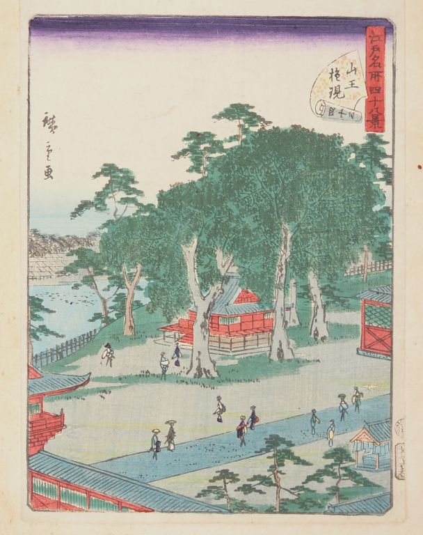 Japon, Quatre estampes de format oban tate-e dont : - deux d’Hiroshige I représentant le Mont Hiyori et le port de Toba dans la province de Shima, de la série des Lieux célèbres des 60 et quelques provinces, l’autre représentant le Hall Komagata et le pont Azuma, de la Série des 100 Vues Célèbres de Edo - deux autres d’Hiroshige II représentant le Sanctuaire Sannô Gongen, n°43 de la Série des 48 Vues célèbres de Edo et le Temple des 500 arhats, n°26 de la Série des 48 Vues Célèbres de Edo Usures, déchirures sur certaines, insolées. Dim. 29 x 19 cm