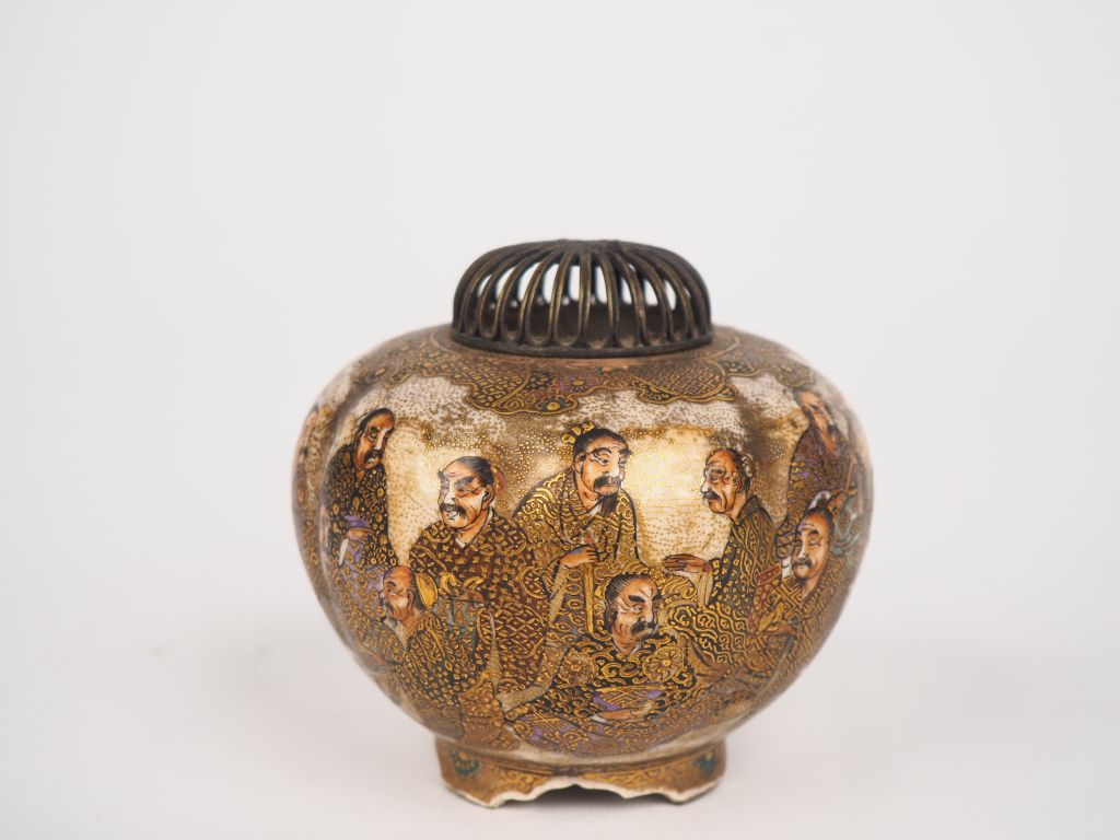 Japon, Satsuma fin XIXe siècle, Diffuseur à parfum en faïence de Satsuma à décor des arrhats, surmonté d’un couvercle en métal argenté ajouré. Marque au revers dans un cartouche « Dai Nihon Satsuma yaki Tsuizan Zô » Petit manque au couvercle H. 10 cm