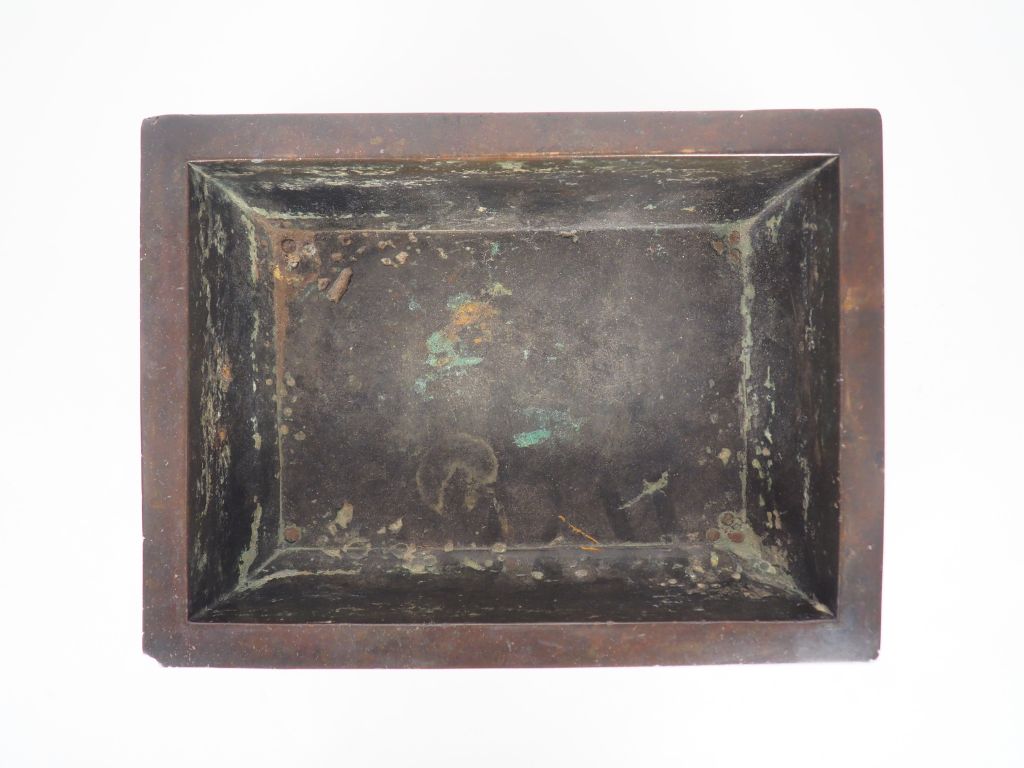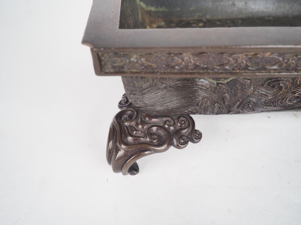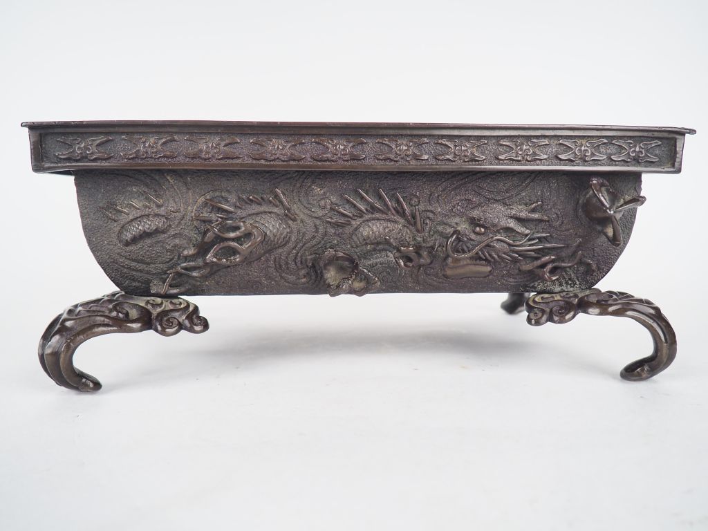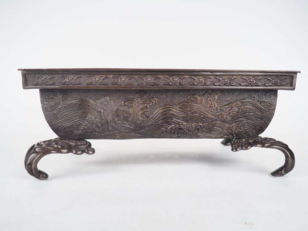 Japon, vers 1850, Bassin ou grand brule-parfum de forme rectangulaire en bronze reposant sur quatre pieds feuillagés, pourtour décoré en relief de vagues écumantes et de dragons, Dim. 13 x 32 x 24 cm