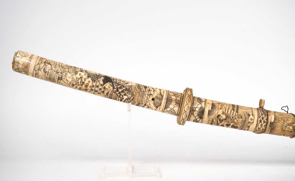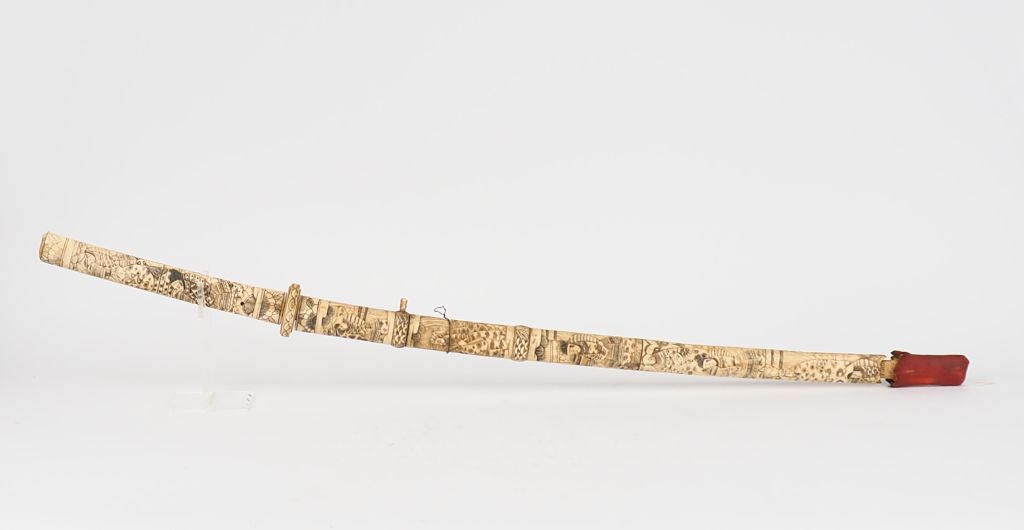 Japon, vers 1900, Important sabre en os, à décor de Samourai. L. 93 cm