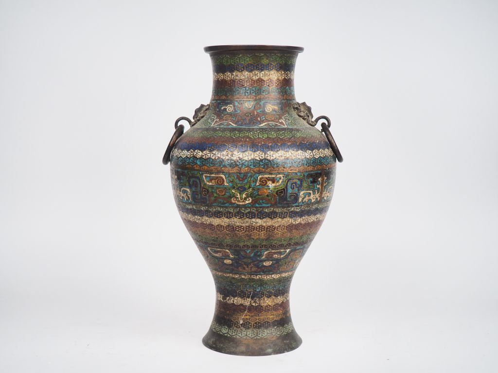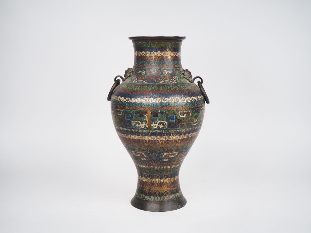 Japon, vers 1900, Important vase balustre en bronze et émaux champlevés à décor de motifs géométriques. Deux masques de taotie retenant des anneaux formant anses sur le haut de la panse. H.41 cm.