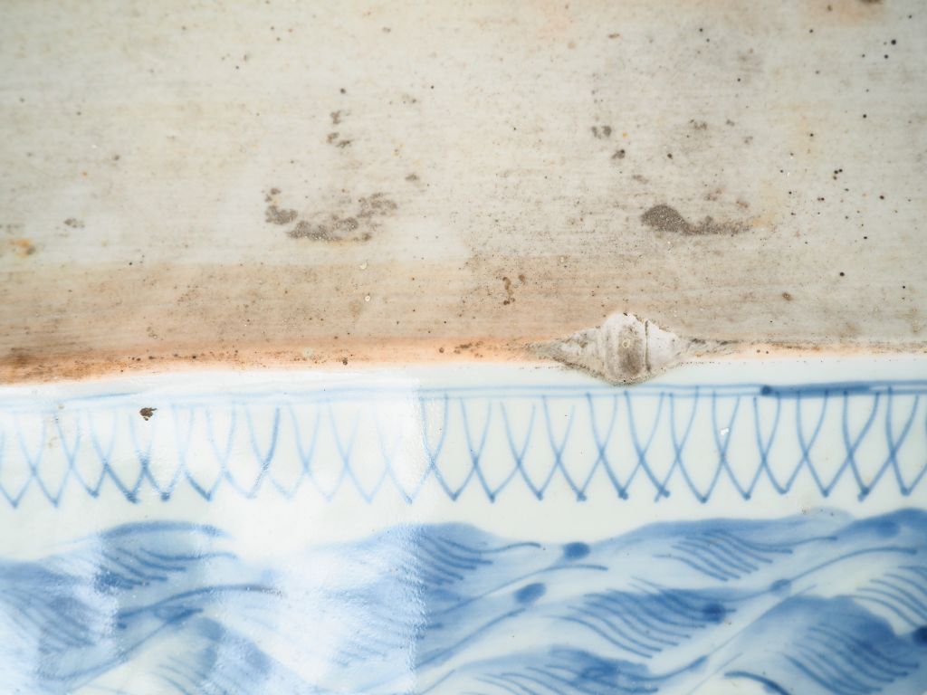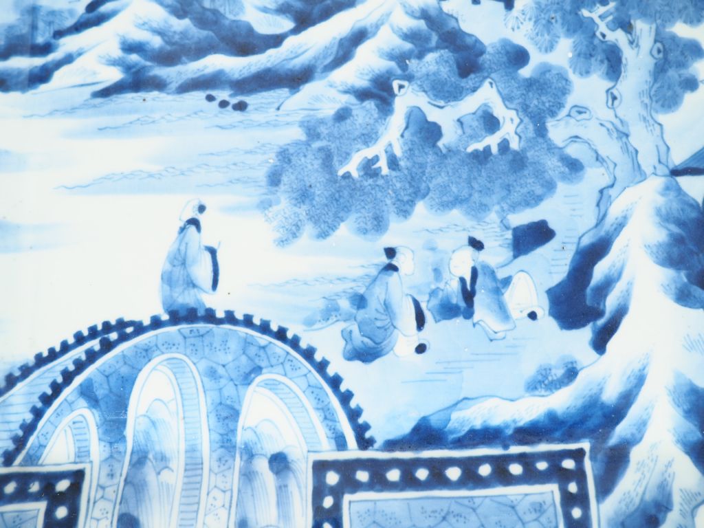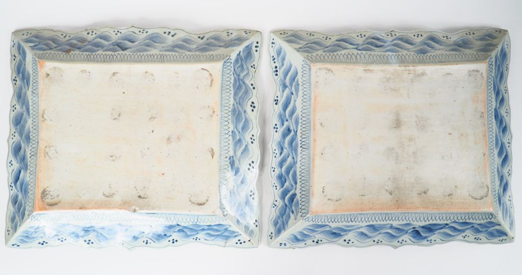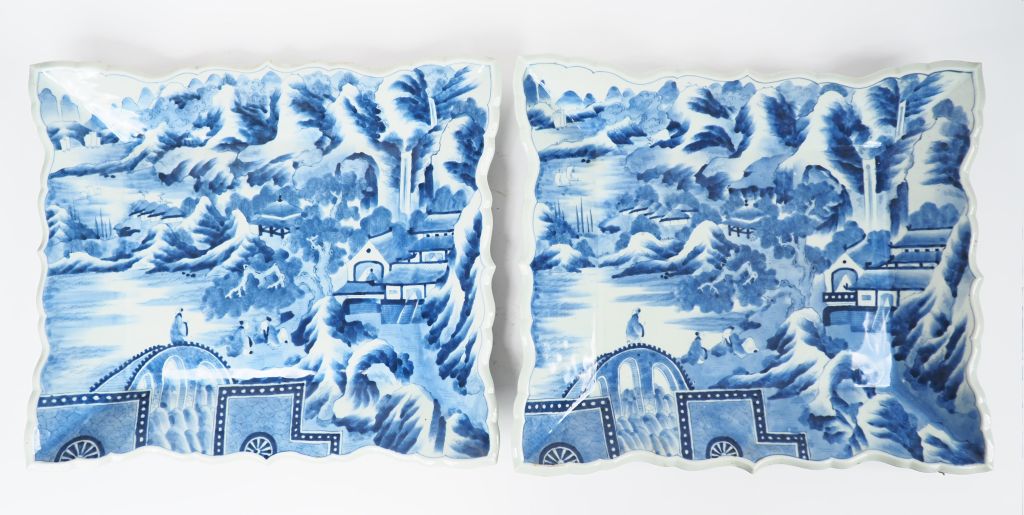 Japon, vers 1900, Paire de grands plats quadrangulaires à bords polylobés en porcelaine d'Arita, décor en bleu sous couverte de lettré sur les berges d'un lac entouré de massifs montagneux (éclats dessous). Dim. 45 x 45 cm