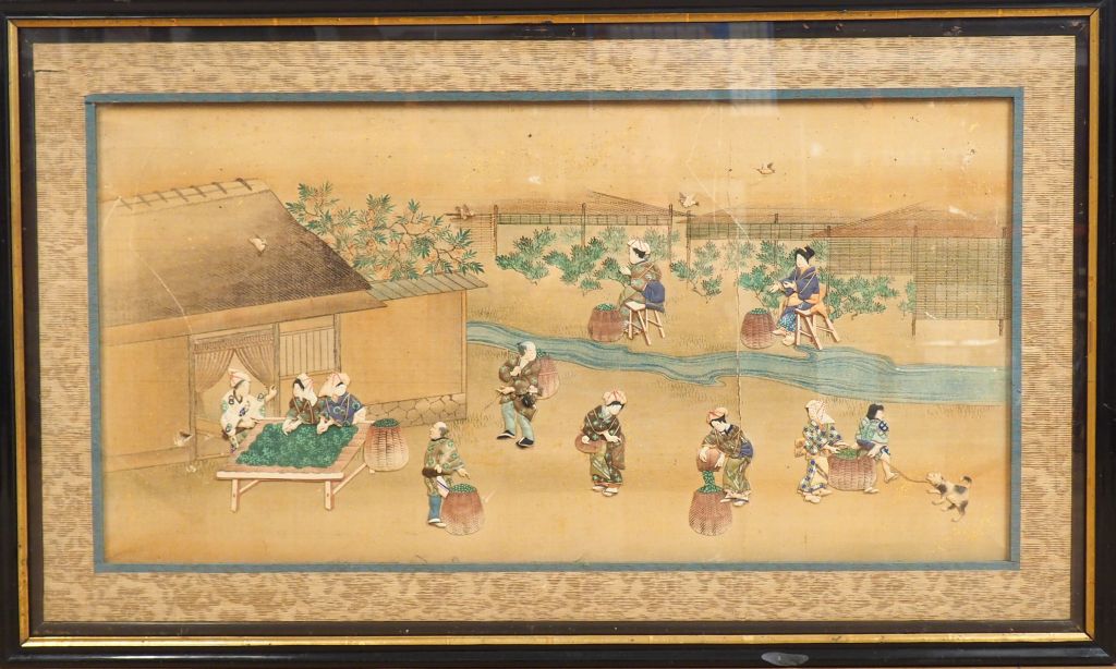Japon, vers 1900, Une tenture sur soie contrecollée sur papier à décor de personnages s’adonnant à la cueillette et au traitement des récoltes. Encadrée sous verre. Dim. à vue. 41,5 x 79 cm