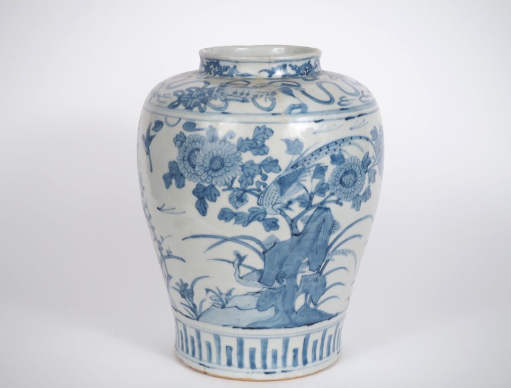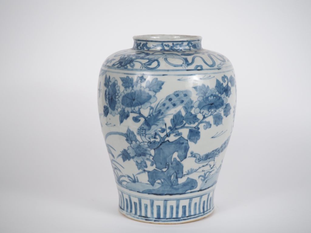 Japon, XIXe siècle, Jarre en porcelaine bleu blanc, à décor de faisans évoluant parmi des pivoines et cerisiers en fleurs. La base du col ornée de lions bouddhiques. Fêle au col. H. 30 cm